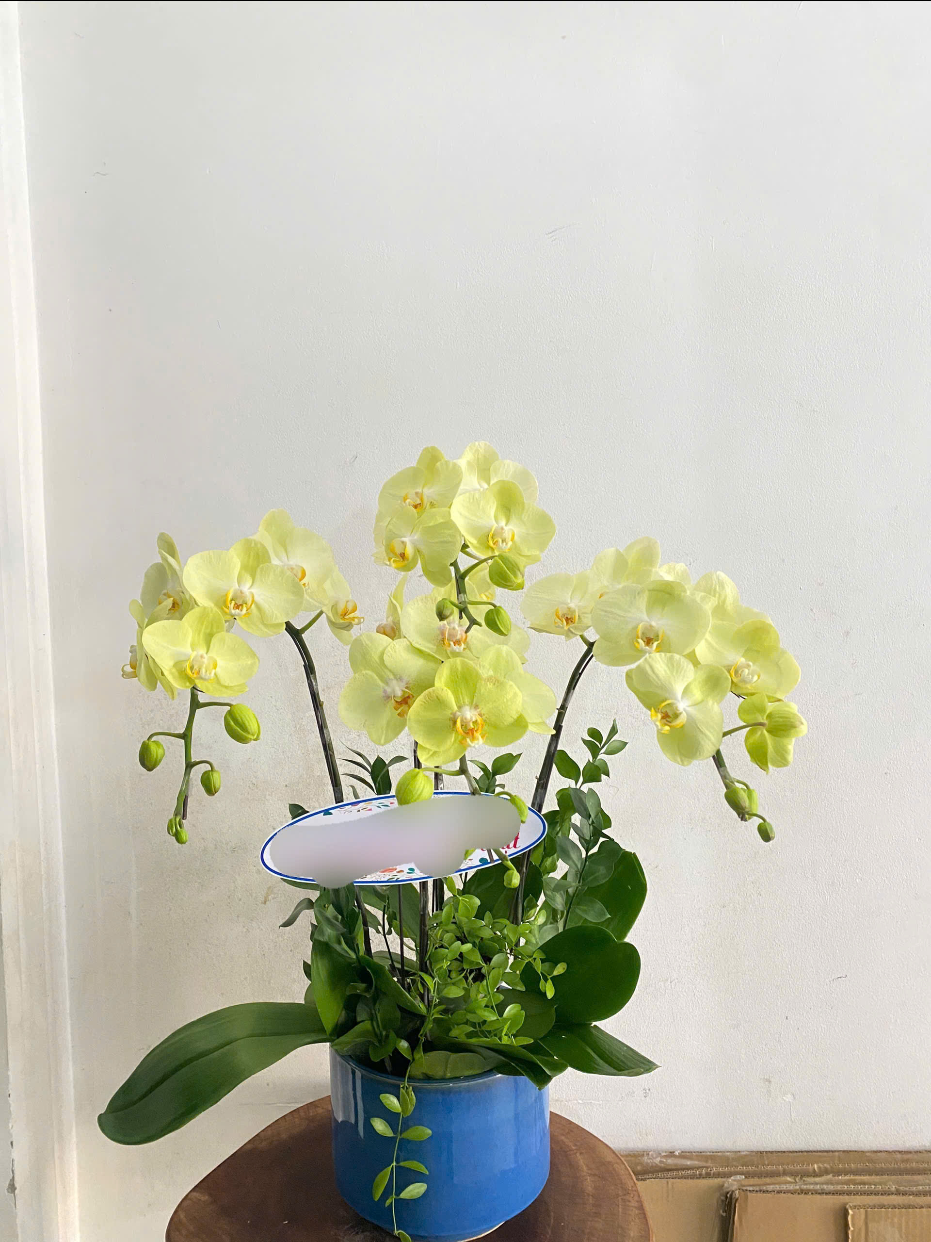 Chậu lan Hồ Điệp vàng nổi bật với sắc vàng tươi rạng rỡ, cánh hoa mềm mại và họng hồng đầy quyến rũ. Một sản phẩm mang ý nghĩa tài lộc – thịnh vượng, thích hợp trang trí nhà cửa hoặc làm quà tặng ý nghĩa.”
