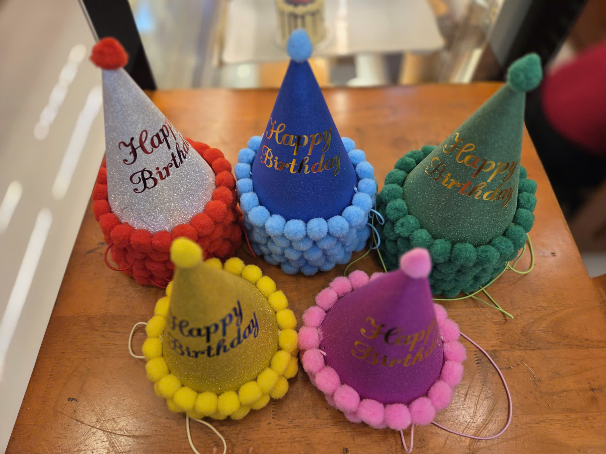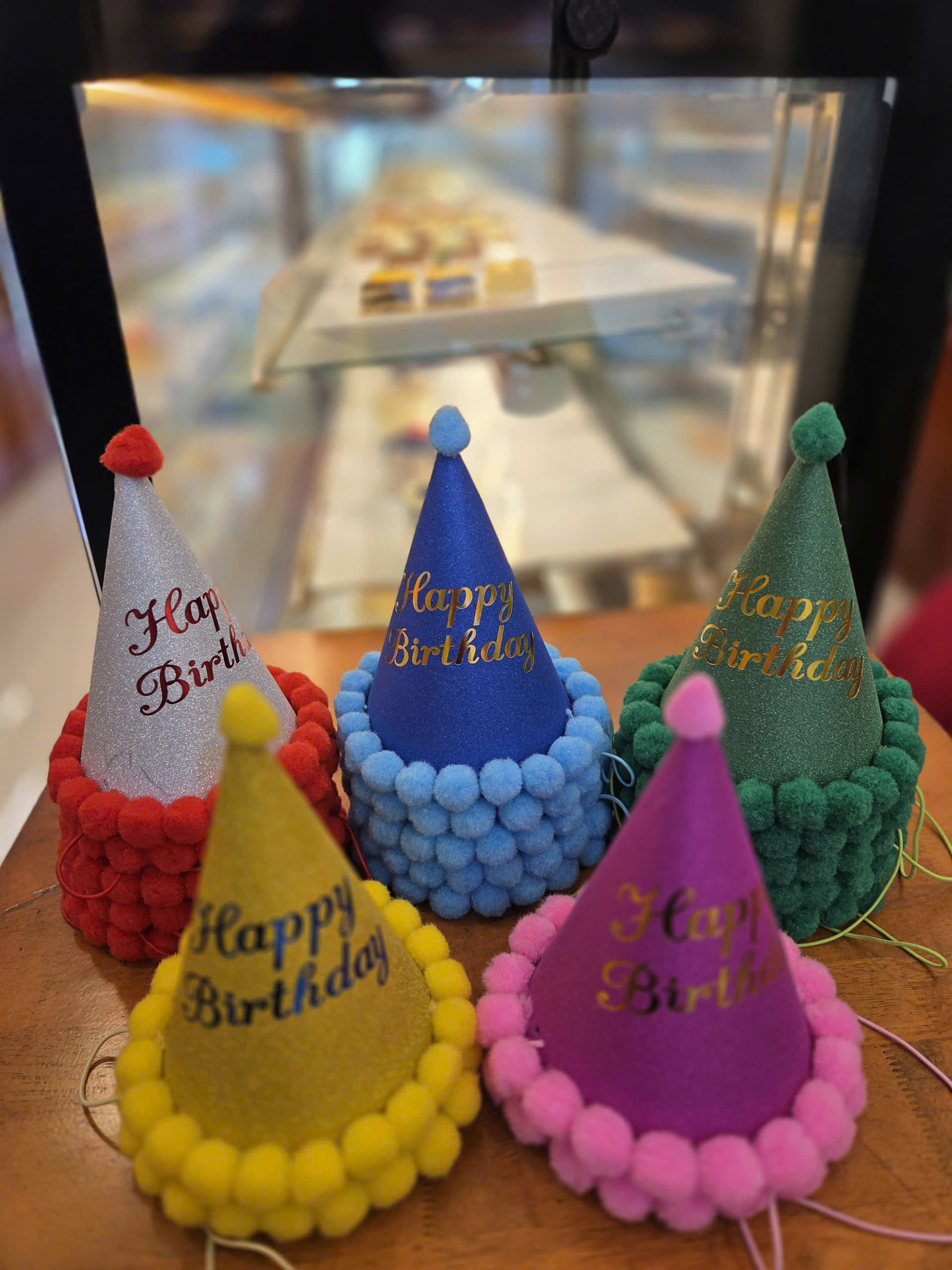 những chiếc mũ sinh nhật hình nón với nhiều màu sắc nổi bật như đỏ, xanh dương, xanh lá, vàng và tím. Mỗi chiếc mũ đều được trang trí bằng lớp kim tuyến lấp lánh, dòng chữ “Happy Birthday” nổi bật và viền pom–pom cùng tông màu siêu dễ thương. Đây là phụ kiện quen thuộc trong các buổi tiệc sinh nhật, giúp tạo không khí vui tươi, rực rỡ và mang lại cảm giác lễ hội cho người tham dự.